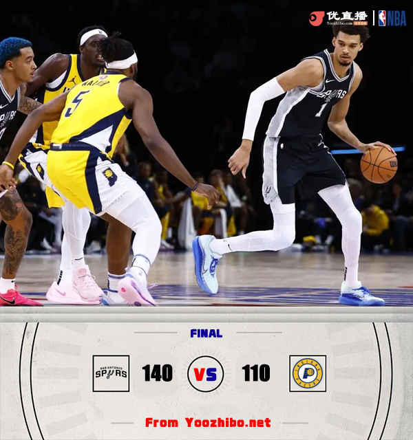 24直播网讯 北京时间1月24日讯 NBA常规赛巴黎赛,马刺对阵步行者。马刺19胜22负西部第12,步行者24胜19负东部第5。一开场,双方大打对攻,比分交替领先,文班亚马里突外投高效输出,步行者多点开花给出回应,次节两队继续缠斗,步行者率先发力占据主动,马刺奋力反击夺回优势,半场战罢马刺60-57领先步行者。下半场,文班攻防两端发力,马刺持续输出单节狂轰45分,一举确立20分以上优势,末节马刺稳扎稳打保持大比分的领先,步行者换下主力投子认负。最终,马刺140-110大胜步行者。
