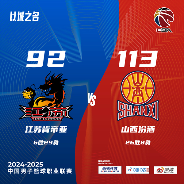 24直播网讯  北京时间1月25日讯 CBA常规赛,江苏对阵山西,江苏上场比赛击败天津结束6连败,山西上场比赛被同曦终结连胜势头。开场后刘传兴多次打内线得手,江苏靠着两名外援的发挥后来居上,两队经过一段混战后,山西队的古德温连续冲击内线追平比分。两队首节都犯规颇多,第二节上来山西依旧多次强攻篮下拿分,贾明儒外线手感火热接连三分命中将领先优势扩大,江苏队靠着外援的发挥努力追分,但全面开花的山西在半场结束时依旧手握15分优势。易边再战,汤普森面对刘传兴多次在中距离投篮命中,不过山西进攻发挥稳定始终保持两位数优势,张宁内突外投接连拿分。最后一节张宁延续状态频频杀入内线帮助山西将分差拉大到20分以上,比赛失去悬念,最终山西113-92轻松击败江苏。