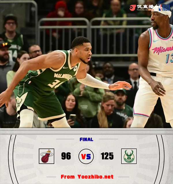 24直播网讯 1月24日讯 NBA常规赛,雄鹿客场挑战热火。雄鹿4连胜以24胜17负高居东部第4,热火21胜21负东部第9。本场比赛因天气原因被延迟1小时开赛,巴特勒被球队禁赛。一开场,雄鹿手感冰凉,热火打出13-3的攻势取得两位数领先,字母哥高效输出带队迅速迫近比分,次节雄鹿全面回暖,单节轰下44分净胜热火19分,利拉德1秒内连投带罚收获6分,半场战罢雄鹿71-55领先热火。下半场,双方命中率下降,得分都很困难,雄鹿率先回暖将分差拉开到20分以上,末节双方围绕20分的分差展开拉锯战,热火大势已去无力回天。最终,雄鹿125-96大胜热火,客场过关。