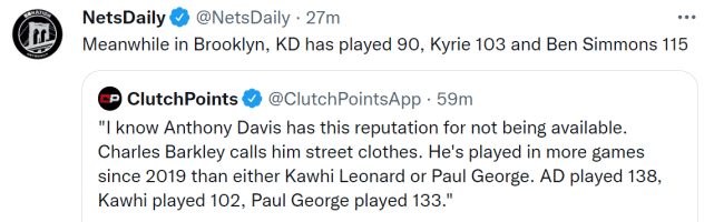 Ramona Shelburne说道:“我知道浓眉的伤病问题是出了名的,巴克利还称他是‘便服小子’,但自2019年来,浓眉出战的场次比莱昂纳德或者乔治都要多。这三年的区间里,浓眉出战138场比赛,而莱昂纳德出战102场(注:实际是109场),乔治出战133场。”