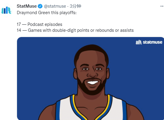 今年季后赛,格林总共参加播客节目17次,得分或者篮板或者助攻上双的比赛仅14次。