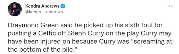 在这一次地板球争夺过程中,库里的腿部被对手压住,躺在地板上十分痛苦,好像受伤了;赛后格林回应第6犯是为保护库里,听到库里惨叫才推人的,表示:你们总是很担心,我看到库里倒地拼抢了。就是这样。我犯规把斯玛特推开,因为库里在人堆下面惨叫。事情就是这样,他主动犯规把斯玛特从库里腿上推开。