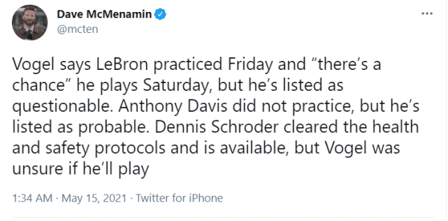 24直播网讯 北京时间5月15日,湖人队已经飞往印第安纳波利斯,他们将明天客场对阵步行者。出发前,湖人进行了一次队内训练,据主帅沃格尔透露,詹姆斯参加了这次合练,有可能在明天对步行者的比赛中出战,目前他的状态是questionable(出战成疑,50%上场可能)。戴维斯没有参加合练,但他的状态是probable(大概率出战,75%上场可能),施罗德也来到训练馆,他和戴维斯一样,没有参加合练,沃帅表示他暂时不确定施罗德能否出战。