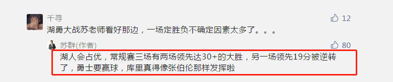 有球迷提问,“湖勇大战,苏老师看好哪边,一场定胜负不确定因素太多了”。而苏群则不认为勇士赢球的机会大。“湖人会占优,常规赛3场交手,2场取得领先达到30+的大胜,另一场领先19分被逆转了。勇士想要赢球,库里需要像张伯伦那样发挥”。