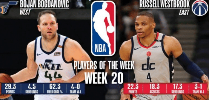 周最佳方面,威少和博格达诺维奇当选,威少已经追平了大O的三双纪录,他在上周场均可以拿到22.3分17.3篮板18.3助攻,带领奇才取得3胜1负的成绩,这样的数据非常出色。西部爵士的博格达诺维奇当选,他带队取得4连胜,米切尔缺席的情况下,博格达诺维奇场均29.3分4.5篮板1.5助攻。