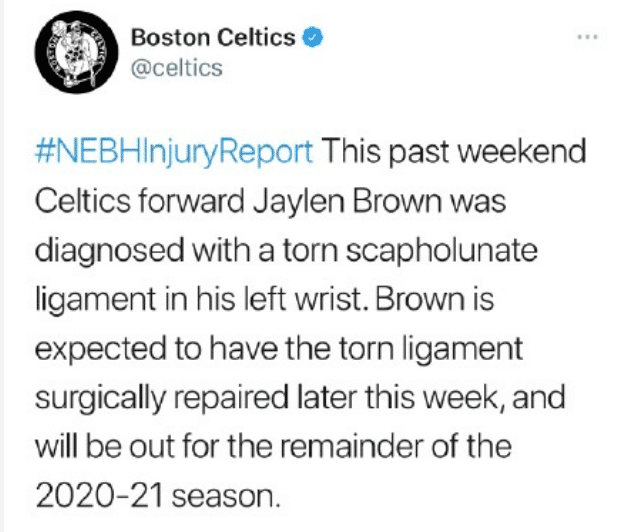 凯尔特人遭遇重创,当家球星杰伦布朗确诊为左手腕舟月骨韧带撕裂,这是他的投篮手,确定赛季报销。布朗和塔图姆的组合是凯尔特人的核心配置,两人也都入选全明星,如今布朗无法出场,他们也排名第7位,还要打附加赛,季后赛前景堪忧。布朗本赛季场均可以拿到24.7分6.0个篮板3.4次助攻。