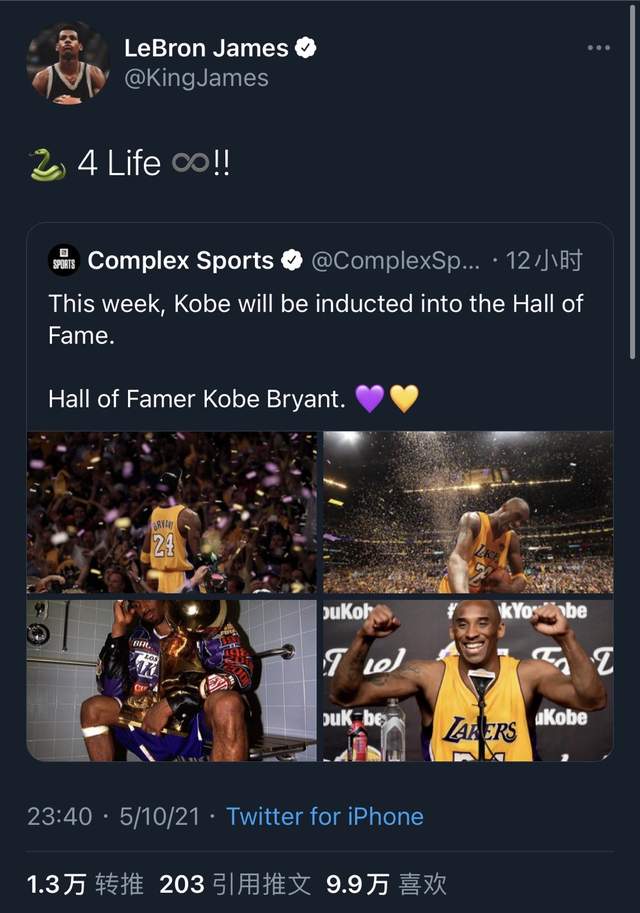詹姆斯在得知科比将会在本周入选名人堂之后也是及时在社交媒体上发来祝贺,詹姆斯的社交媒体上罕见转载了体育媒体的推文,而且还自己配文曼巴永垂不朽。由此可见詹姆斯对于科比的怀念和敬佩之情,其实从进入联盟以来,科比就一直是詹姆斯追逐的对象,科比曾经很多最年轻的得分成绩也是由詹姆斯打破。他们两人之间惺惺相惜,他们之间的关系也比球迷眼中的关系好很多。