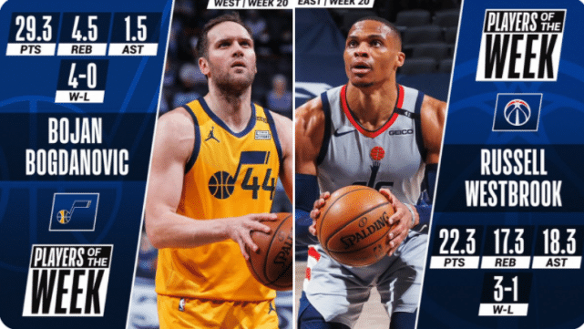 24直播网讯 北京时间5月11日,NBA官方宣布了上周的周最佳球员。东部周最佳属于奇才后卫拉塞尔-韦斯布鲁克,西部周最佳则由爵士前锋博扬-博格达诺维奇当选。
