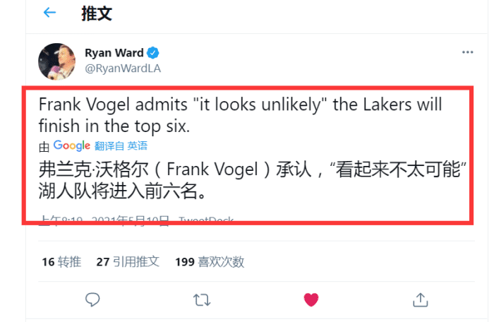 24直播网讯 北京时间5月10日,湖人主场迎战太阳,在这场比赛前,湖人主帅沃格尔在接受采访时承认,球队“看起来不太可能”以西部前六的战绩直接打入季后赛!