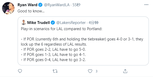 如果开拓者2胜2负湖人5战全胜、如果开拓者1胜3负,湖人4胜1负以及开拓者4战全败湖人3胜2负,在这三种情况下,湖人才能重回西部前六之列,也就是不用打附加赛。