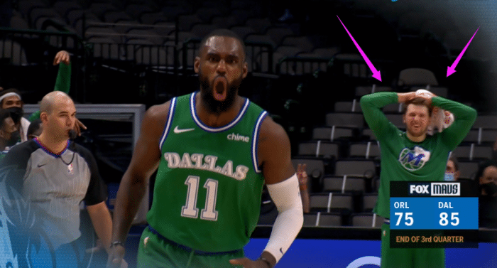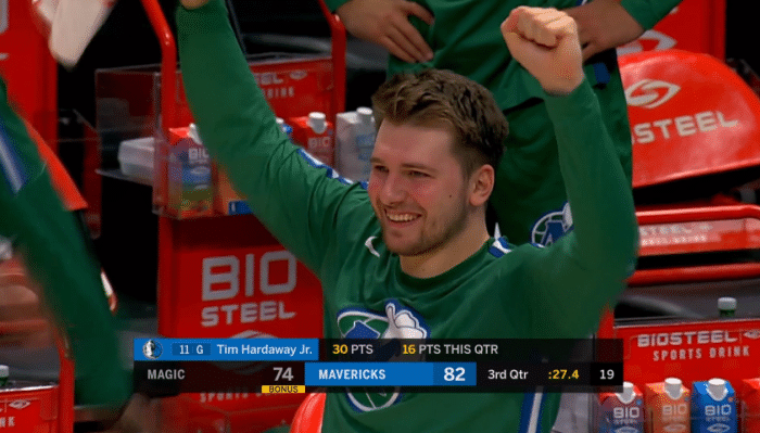 下半场,东契奇第三节大多数时间都有些进攻着急,连续几次出手不进还频频失误,东契奇状态不佳,此节小哈达威突然拔剑出鞘,单节8投6中、三分4中3独砍16分,场边的东契奇心情大悦,满脸笑容,小脸红彤彤的;三节结束前最后一攻,东契奇顶着戈登的防守打进巨星球,命中压哨三分,东契奇再次咧嘴大笑,心情明显好起来。