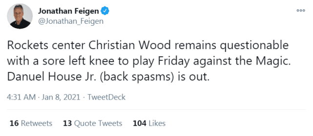 24直播网北京时间1月8日讯,火箭官方更新了球队的最新伤情。缺席对步行者一战的豪斯和伍德,依然在球队的伤病名单上。豪斯由于背部痉挛,将继续缺席主场对魔术的比赛,而伍德(左膝酸痛)是出战成疑(questionable,50%上场可能)的状态。