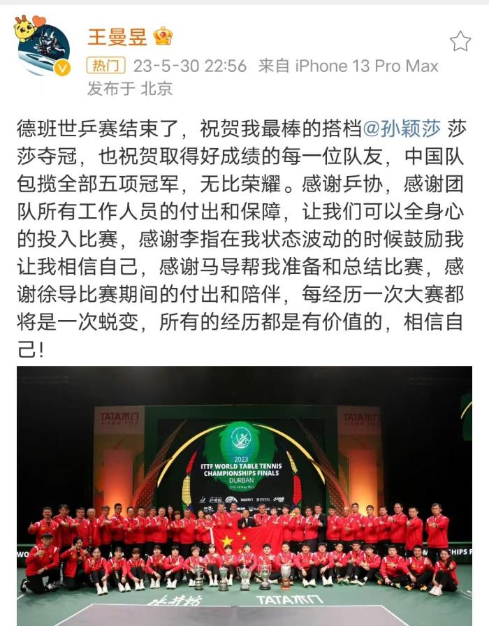 而在马琳的一通甩锅后,29日的22时,王曼昱也是在社交媒体上进行了表态。在长文中,王曼昱感谢了自己的搭档孙颖莎,感谢了国乒所有工作人员的付出。