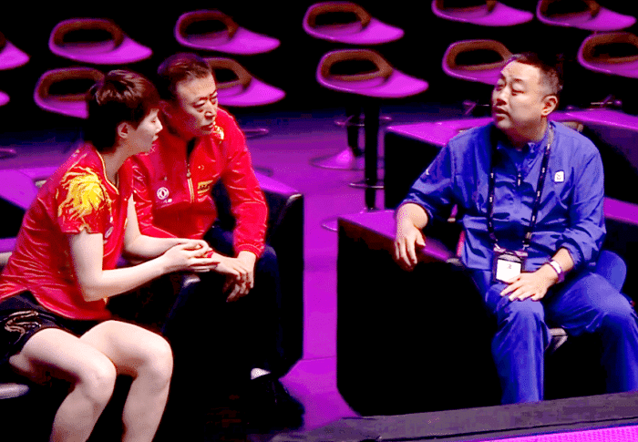 在对阵钱天一的比赛之前,王曼昱坐在场边观赛,此时刘国梁也是来到场边观战,如果是以往,按照王曼昱的性格也就是各自看各自的,可是随着比赛的进行,王曼昱也是主动的找刘国梁求教,刘国梁也是耐心的给王曼昱进行了解答,在一番沟通交流之后,刘国梁还和王曼昱两人碰拳鼓励王曼昱。