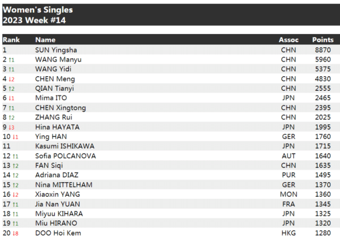 24直播网04月04日讯 国际乒联公布了2023年第14周的排名,因为此前奥运积分清零的原因,所以排名有很大的变化,比如男单的马龙从第二下滑到第四,王楚钦和张本智和的排名提升。女单的变化也非常大,王曼昱升至第二,王艺迪升至第三,钱天一升至第五,排名下滑的是陈梦,她从上一期的第二名来到本周之后排名跌至第四。