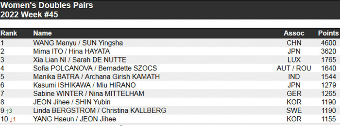 男双领域:樊振东和王楚钦排名世界第三,积分为2350分。王曼昱和孙颖莎的“海产姐妹花”以4600分高居女双世界第1,这两人也是世乒赛冠军组合,属于强强联手,取得辉煌的成绩。伊藤美诚/早田希娜第2、倪夏莲/德努特排名前3。