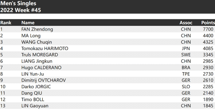 樊振东以7700分领跑男单,领先第2名的马龙足足3300分,稳居第一。值得一提的是王楚钦排名第3,他和马龙之间的差距很小,只有75分的差距。11月份的王楚钦还有亚洲杯的任务,不出意外的话,他的排名会超越,老大哥马龙,升至第2名。被禁赛的梁靖崑排名男单第6,此前他最高的名次到过第3位。林高远依旧位居世界第13名,他也将出战亚洲杯。