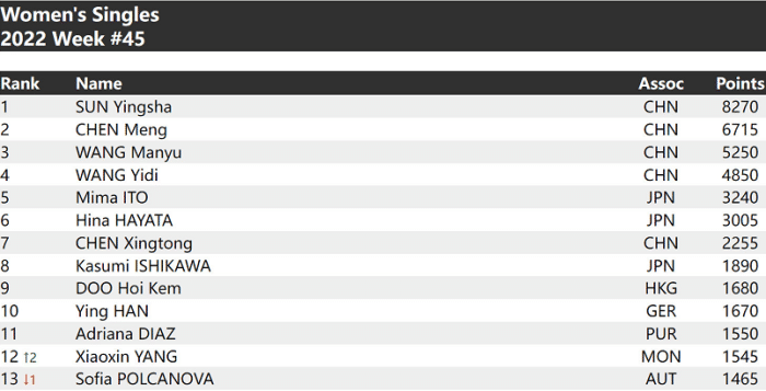 女单:孙颖莎力压陈梦;