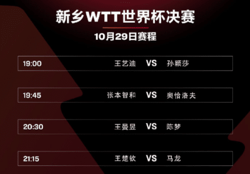 24直播网10月29日,新乡WTT世界杯决赛的单打半决赛将会在今天晚上开战,对阵:王艺迪大战孙颖莎、张本智和迎战奥恰洛夫、王曼昱死磕陈梦、王楚钦对决马龙,比赛从晚上7点开始,赛制也发生变化,从前两轮的5局3胜升级为7局4胜。