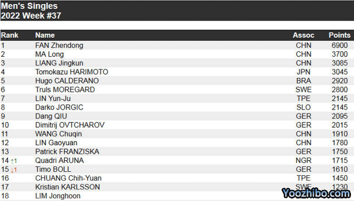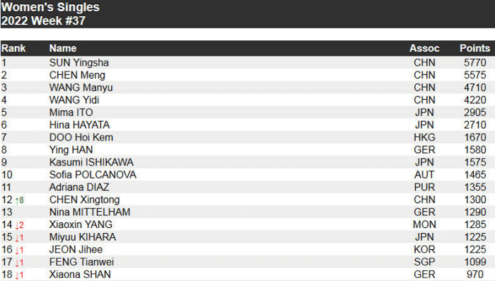 24直播网09月13日,国际乒联第37周世界排名更新,本周变动不小。在罗马尼亚和阿曼连续夺冠,同时拿下世锦赛参赛资格的陈幸同成为最大赢家,她从上周的第20名来到女单世界第12名。亚军崔孝珠排名上升39位,排名女单第52名。在阿曼斩获男单亚军的梁俨苧排名暴涨449位,来到了第68位。尼日利亚选手阿鲁纳非锦赛夺冠,反超波尔,升至男单第14名。