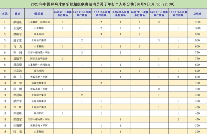 比赛开始前,梁靖崑1350分位居男单第一名,王楚钦1050分位居第二,梁靖崑处于领先,很大的原因是因为昨天他赢下了3场男单的比赛,而王楚钦昨天是没有比赛任务的。所以此消彼长的原因,梁靖崑在昨天比赛之后扩大了领先优势,而王楚钦单打的场次偏少,自然积分也更少一些。