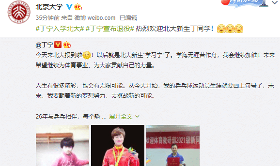 丁宁入学的北京大学也欢迎:“热烈欢迎北大新生丁同学!”。不少人调侃“乒乓球北大杯再无悬念”,大满贯和全满贯得主的丁宁来了,将长时间垄断这个项目的冠军,而且是毫无悬念几乎全部横扫夺冠的那中。