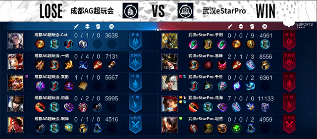 双方和平开局。1分30秒阿古朵入侵野区,马超拿下一血。2分55秒河道团战,马超被击杀。4分30秒狄仁杰推掉下路一塔。4分50秒阿古朵拿下暴君,团战武汉eStarPro打出0换2。6分45秒张飞被击杀。7分钟武汉eStarPro入侵野区,云缨被击杀。8分55秒狄仁杰推掉中路一塔。9分17秒阿古朵拿下暴君。10分35秒暴君团,云缨被击杀,阿古朵拿下暴君。11分21秒马超推掉中路二塔。12分钟武汉eStarPro推掉上路高地塔,团战打出0换2。12分25秒武汉eStarPro团灭成都AG超玩会推掉水晶拿下本场比赛胜利。