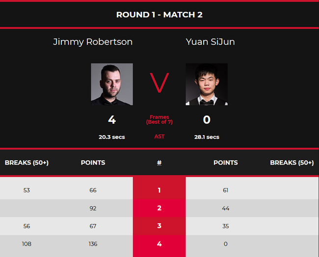 小将袁思俊始终没有找到什么状态。首局,他多次上手,拿下61分,但关键失误葬送好局。吉米-罗伯逊趁机打出单杆53分,以66(53)-61实现单局逆转,先胜一局。第二局,吉米-罗伯逊再次通过多次上手,以92-44再胜一局。第三局,吉米-罗伯逊又打出单杆56分,以67(56)-35获胜。第四局,他更是直接轰出单杆108分,以136(108)-0零封袁思俊,大比分4-0晋级。